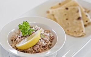 Mas huni is a typical Maldivian breakfast, composed of tuna, onion, coconut, and chili.[2] All ingredients are finely chopped and mixed with the grated meat of the coconut. This dish is usually eaten with freshly-baked roshi flatbread and sweetened hot tea.[1]