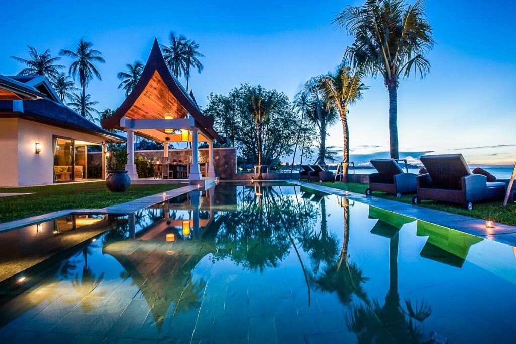 This beachfront luxury villa rental is a luxury tropical retreat located on the North coast of Koh Samui in Thailand.