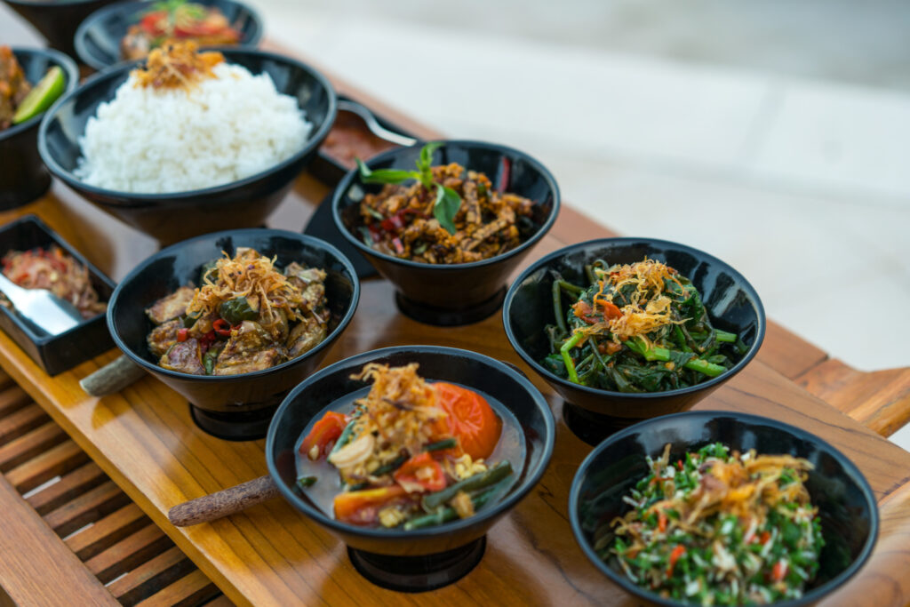 After a small snack you’ll be left wanting for more, I can guarantee that. So let’s get down to business. If you want to try a soup, then you must go with the Mie Bakso. The ingredients used for this one you would use to make 3 or 4 different soups. It’s made out of beef meatballs served in a bowl with beef broth, vegetables, egg, tofu, noodles, Chinese cabbage, bean sprout, fried shallots and celery. I know you’re thinking about how big the bowl is so you can put all these together, but that’s not important. That extraordinary taste is important. You will feel 90% of the tastes available in worldwide cuisine in a bowl filled with Indonesian and Chinese history that will make you wonder how is this even possible, to get such a good taste from all kinds of different ingredients. Well, don’t lose too much time meditating on this because your soup will get cold. Another soup you will enjoy is the Ketupat sayur which, in a simplistic way, is a chicken soup with rice. But nothing is simple in the Indonesian cuisine and as all the others dishes, this one also has lots of ingredients. It’s made out of pressed rice with chicken (or beef) soup on top of which you add coconut milk, jackfruit, labu and krupuk. It’s impossible to recreate this at home! If you’re not a big fan of soups don’t worry, we have some tips for you also. The only thing that is similar to soups (and all Indonesian dishes in general) is that you’ll receive a plate that’s full and that has at least 10-15 ingredients. Except for those situation where you don’t receive a plate and instead you receive a “plate” made out of leafs, like you would if you order Betutu. This is a Balinese dish made out of steamed chicken or roasted duck and it’s one of the best spiced dishes you can find. If it’s not spicy enough, you can order another sauce out of onion, red chili peppers and coconut oil, but we think that the normal version would be enough. You will find this in every menu in Bali, from small restaurants to high-end, fancy places; it’s one of the most popular traditional meals. Another very good meal is the Lawar – it’s a mix, like everything else, of pork minced meat, vegetables, coconut oil and herbs like lemon grass, shallots, garlic and kaffir lime leaves. It’s served hot and usually with rice; you’ll find this at every restaurant and warung around Bali so don’t miss out, go and grab a plate because it’s definitely worth it.
