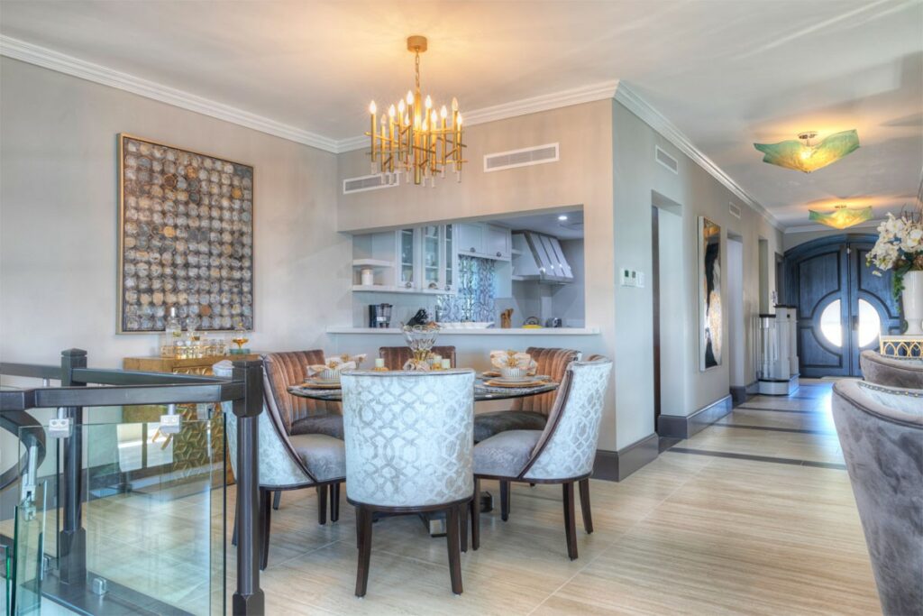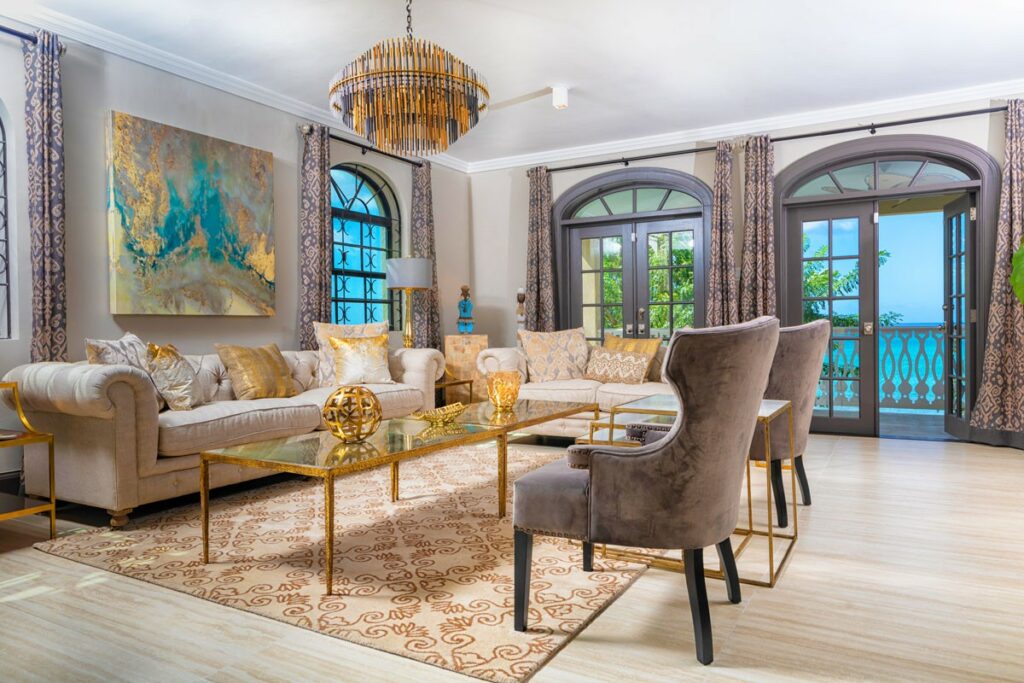 The entryway is chic it is connected to the large living area with plush furnishings, statement chandeliers