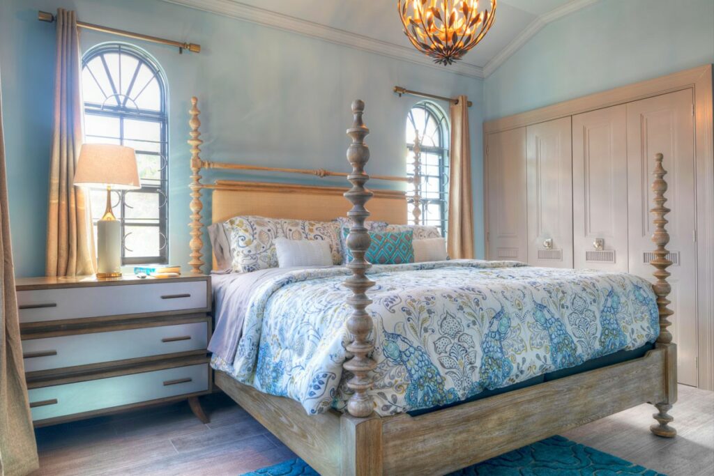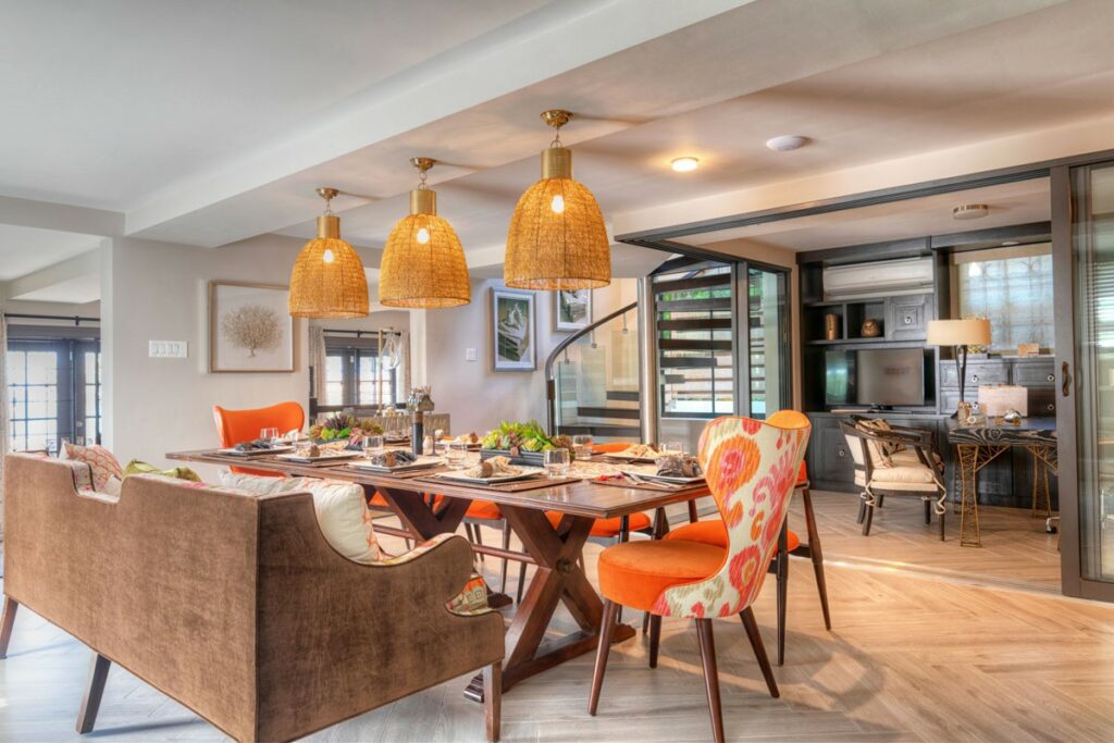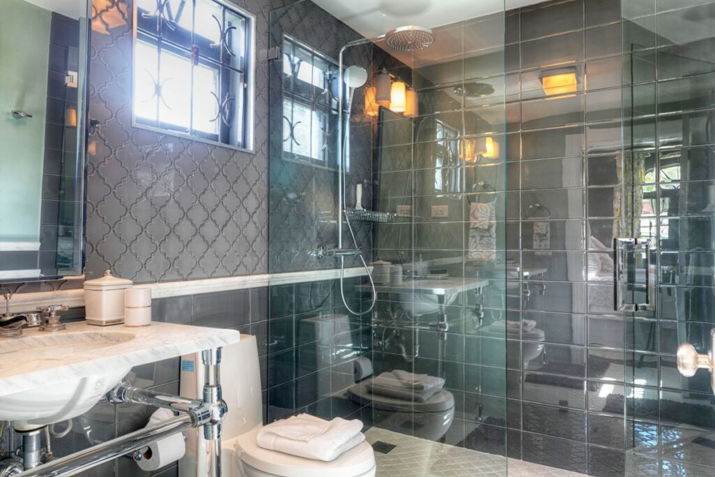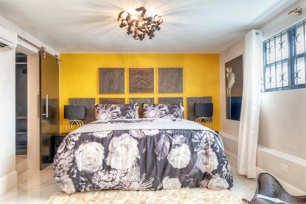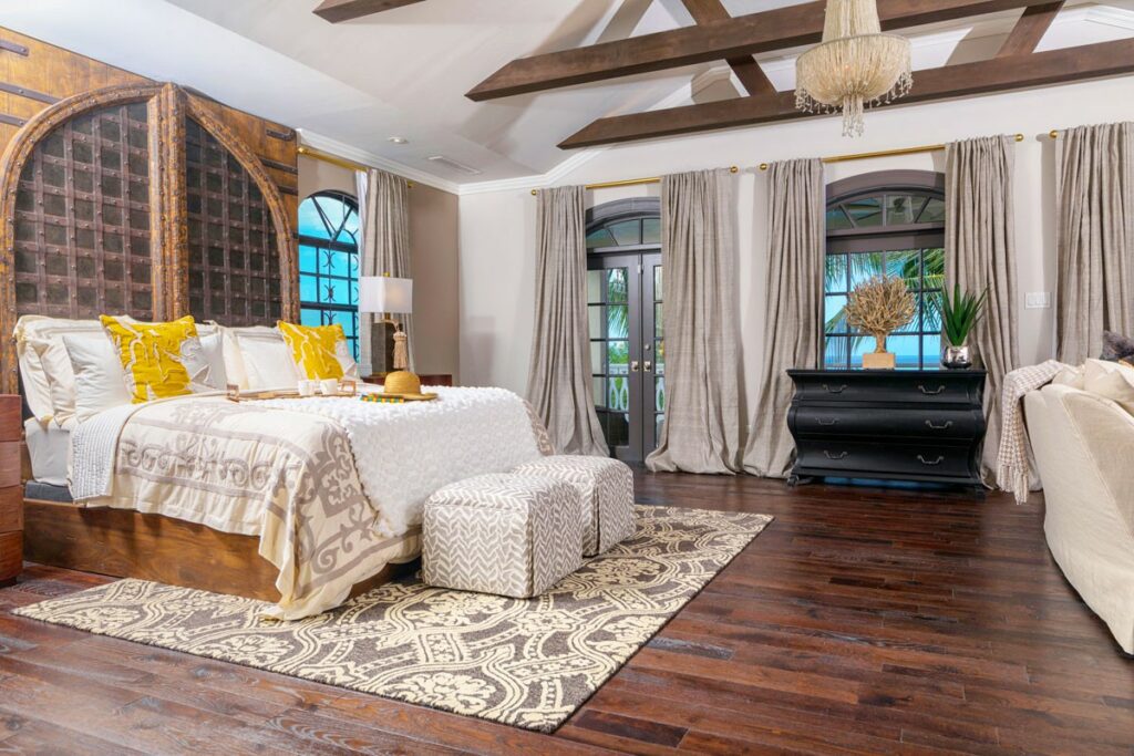 On the second floor, there is the second guest bedroom with a king-size bed, built-in wardrobes, and a stunning en suite bathroom. The elegant master bedroom is beautiful with wooden beams suspended from the ceiling and lit up with warm recessed lighting. The breathtaking king-size bed features a repurposed church door as the headboard that exudes old-world glamour and commands the room. There is a bright and airy walk-in closet, gorgeous en suite bathroom with marble flooring and a Jacuzzi bath and a cozy seating area with an entertainment system for those who want a little quiet time.