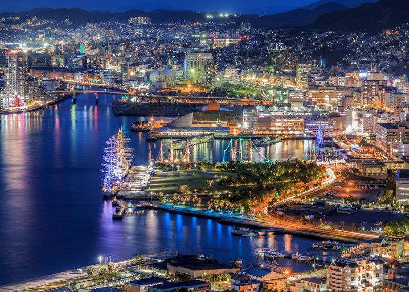 In the city, you can also see the “bridge of glasses”, Meganebashi, a beautiful stone bridge that runs through the Nakajima river in the center of Nagasaki, and a few kilometers from the city center, Monte Inasa offers a magnificent view. On the city.